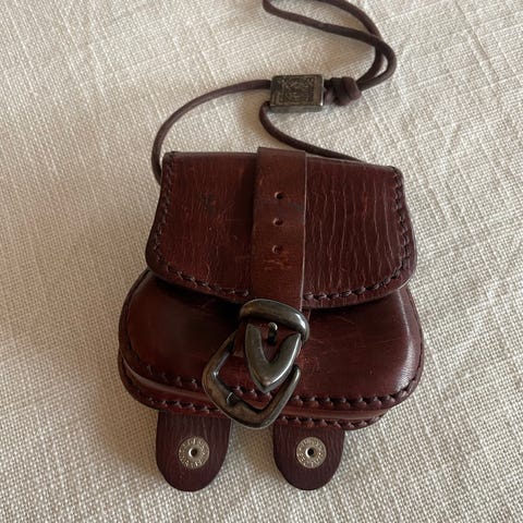 Nydelig veske med plass til mindre mobil med bronsefargede nagler på siden og liten tilhørende pung / nøkkelholder i skinn fra franske Lamarthe.