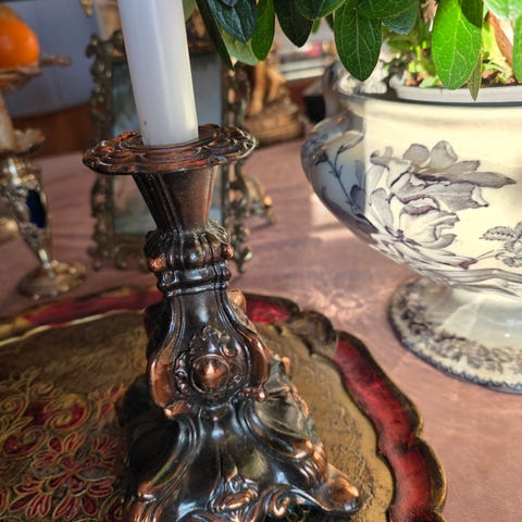 Nydelige gamle engelske messing lysestaker som er ca 180 år gamle. De er Biedermeier dvs fra ca 1830 - 1850. De er i meget god messing kvalitet og i god stand.