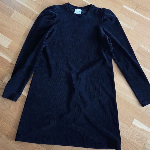 Lengden målt fra skuldersøm og ned er ca 93 cm. Bredden tvers over brystet målt fra sidesøm under arm er 46 cm. En fin kjole i chenille med et enkelt snitt, lange armer med rynkede skuldre.