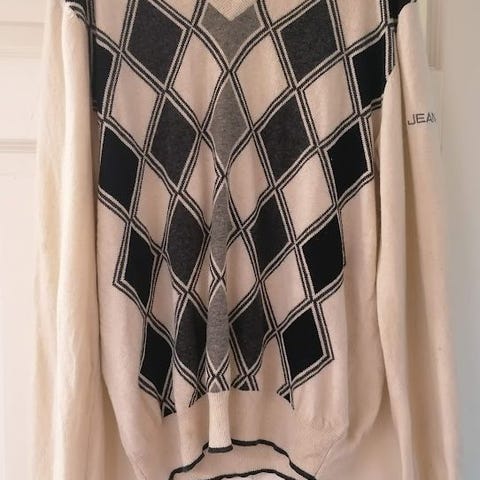 Hvit/krem, flettestrikket, høyhalset, langermet chunky cableknit, tjukkgenser. Patcher med hull under armene. Flatstrikket rygg. Flette, mønsterstrikke foran. Høy polohals med store lærknapper. Ribb i alle ender. 70% lammeull, 30% nylon