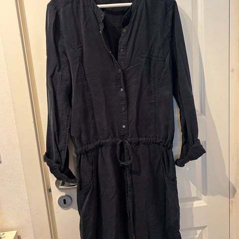 Kjole fra Dranella i str. 40. Den er sort i bunn, med blomster i mønster. Den er foret. Blonde rundt halsen, som går ned i en V foran. Den har glidelås bak, fra nakken og ned. Den har halvlange ermer. Brukt 2 ganger.
