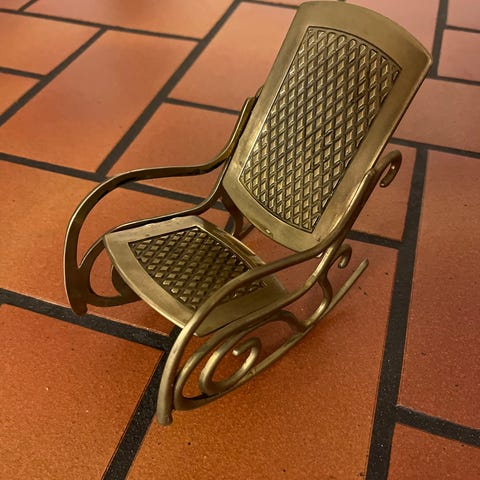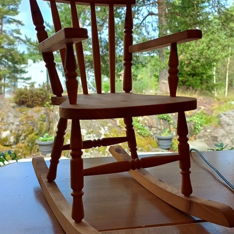 Flott gammel vintage gyngestol. Rød med dekor i hvitt og blått. Sjarmerende bruksslitasjer må påregnes. Fin til nisse eller til dukke. Måler høyde 29cm, 20cm på det bredeste, 31cm lengde.