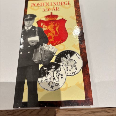 Selger minnemynt 5 kr. utgitt i anledning Postens 350 års jubileum 1997. Mynten ligger i plastikk som vist på bildene.