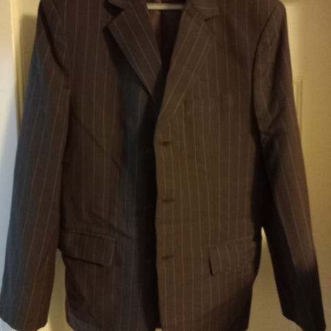 Svart dressjakke med tynne lyse striper. Er i 60 % ull. Fra Giovani. Str. S / 179.