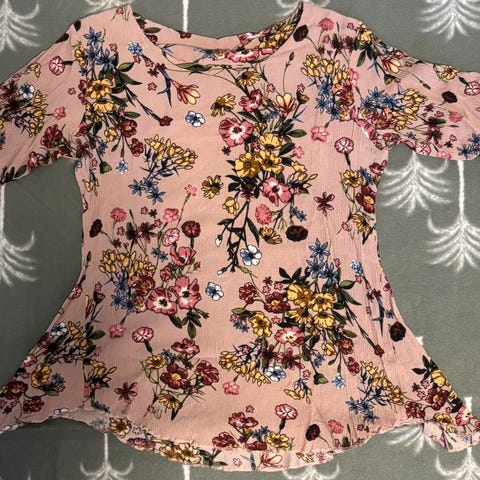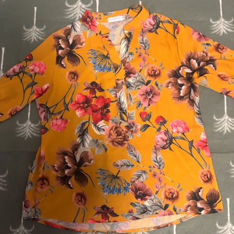 Pen og deilig bluse med blomstermønster i svart, hvitt, rosa og gult. Glidelås foran som gjør at du kan bestemme hvor åpen du vil at fronten skal være. Ermene kan rulles opp og festes med bånd. Blusen er veldig deilig å ha på om sommeren, og er også veldig fin som pyntebluse. Den er dessverre ikke helt min stil lenger. Kjøpte den en gang jeg var i Australia for en del år siden, men har ikke brukt den så mye.