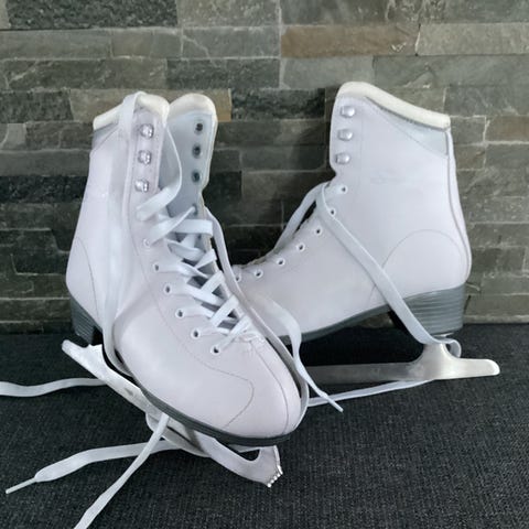 Pent brukte skøyter i ulike størrelser. Pris under hvert bilde