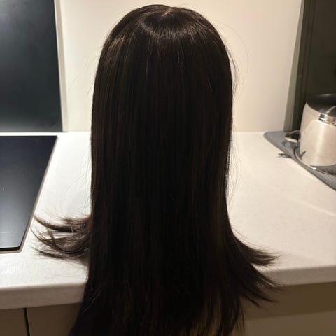 Kjøpt i 20023, men ikke tatt i bruk. Syntetisk hår, litt asymmetrisk og i flere nyanser brunt. Størrelse 52-54 (hodeomkrets). Ny pris var kr. 10.060. Uåpnet sjampo og balsam som kostet