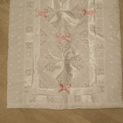 Et strikket og to foret og vatttert tepper med strikket felt.