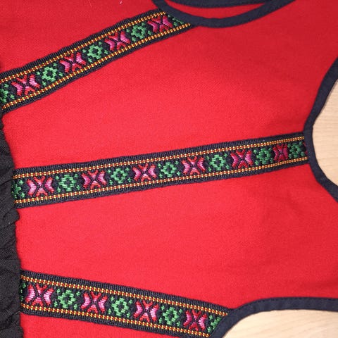 Håndvevet belte til jente. 53 cm + flettede frynser (15 cm lange). Ullgarn. To rødfarger og hvitt. Teknikk: Renningsrips som gir striper på langs og kjerringtenner. Til en jente som er glad i å pynte seg.