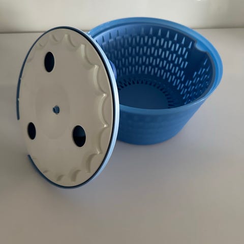Dørslag med hull. Slynger raskt uten å ødelegge salatbladene.