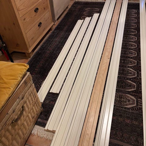 Ubrukt furu hvit fotlist. Det ER totalt ca 6 meter som er kappet i ulike størrelser. Det selges som det er.