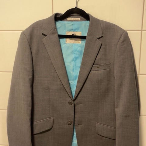 Brukt engang i ett bryllup i Frankrike, men ellers ikke brukt. Fargen er svart og denne dressen er lagd i Italia. Selges derfor for 1500,-