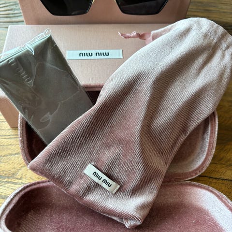 Solbriller med etui, pusseklut og pose. Brukt noen få ganger. Fremstår som nye, uten merker eller riper.