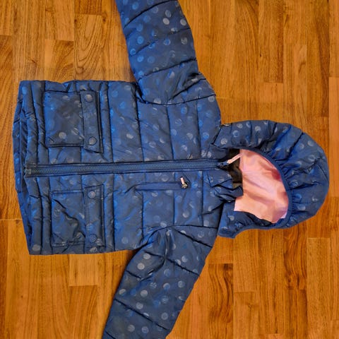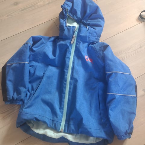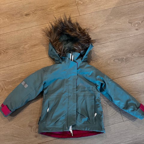 Merke Vill. Ingen hull eller synlig slitasje. Pent brukt. Dyrefritt hjem. Fleese i innerfore. Avtagbar hette med knapper.