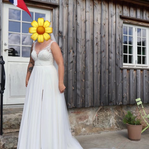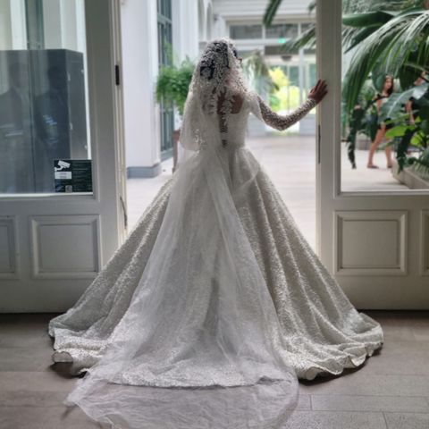 Selger min nydelig brudkjole med slør ❤️😍 det er også en knapp (ikke synlig) på bakk så det kan fint settes opp for lettere dans og likende 🥰 Brukt 1 gang. Rett etter rens. Tilpasser en S eller liten M. Kan prøve hos meg på salongen i Kristiansand sentrum.