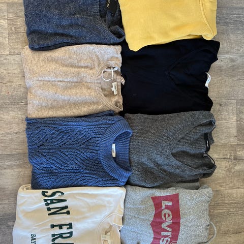 Selger et veldig pent brukt klespakke med gensere for dame. Plagene er lite til veldig pent brukt. Blanding av tynne og tykke gensere.