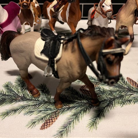 Hesten er 11 cm høy, selges kr. 80. Giraffen er 14 cm høy. Den selges for kr. 70.