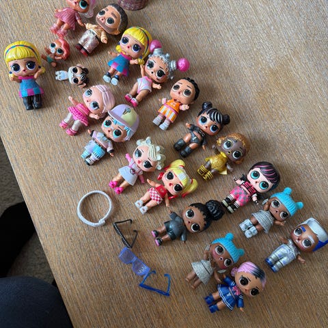 Diverse LOL-dukker som er lekt med selges. Den ene med hår har fått seg en hårklipp og en har fått ny kropp.