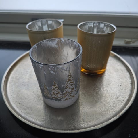 Sølvfarget speilfat / fat / pyntefat / lysfat med 5 stk. telysholdere i glass / telysglass / lykter / lysholdere. Det følger også med 2 gamle sennepsglass med porselenslokk, som jeg synes passet godt som en brytning mot de andre glassene. Selges samlet kr. 200,-. Hentes Lillehammer. Kan også sendes mot at kjøper dekker porto. Kan også sendes med PostNord kr. 69,-.
