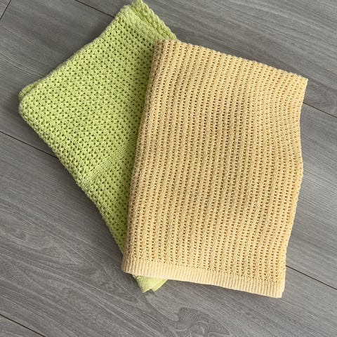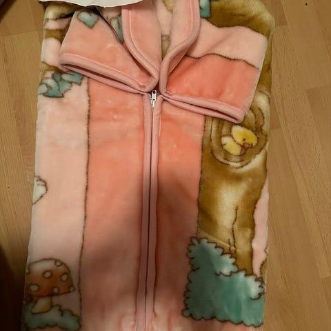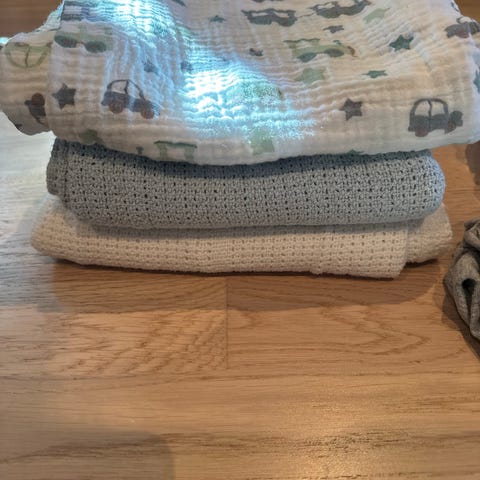 2 helsetopper (hvit og grått) og to fleecepledd til baby (vogn / vugge).