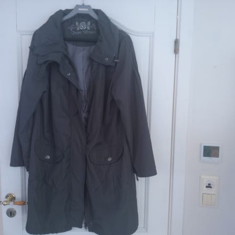 Dette er en god høst, eller vårkåpe som er vindtett. Den har en god hette og lukkes med glidlås innerst og knapper i et ekstra stofflag.