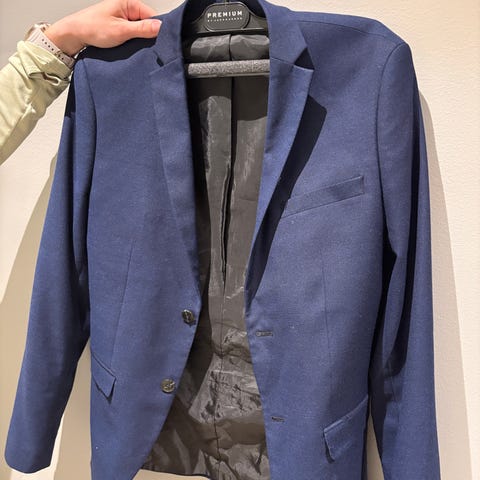 Blå dress ( type slim ) str 44 fra Jack & Jones selges hbo 450,-Brukt kun 2 ganger. Kan få med hvit slim skjorte på kjøpet ( ( fra Jack & Jones i str S)