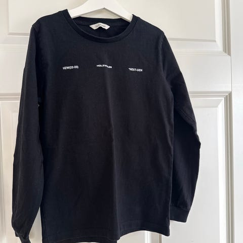 Svart genser m stilig strassmønster rundt halsen. Tykt collegestoff med myk flosset innside. Str. 146/152 cm, 10-12 år fra H&M.