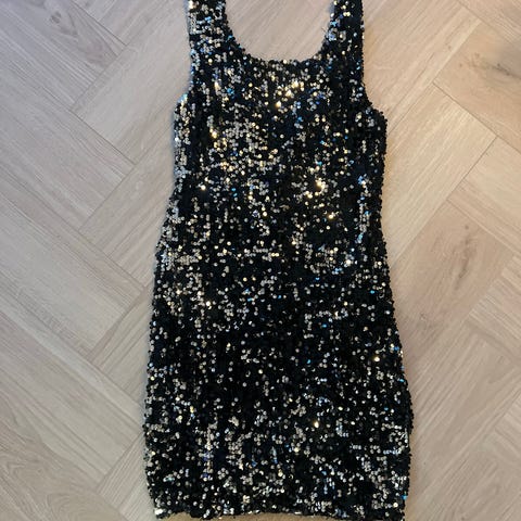Paljettkjole i svart og sølv selges. Den er fra X Company og er brukt én gang.