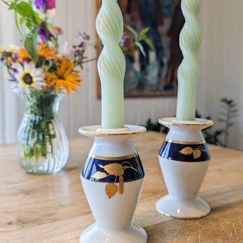 2 like lysestaker i messing med emaljemalte blomster - 21,5 cm høye. Dia fot 10,2. - kr. 180,-.