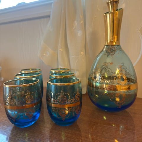 Gullbelagt Veneziansk vintage glasskaraffel m/ 6 glass.