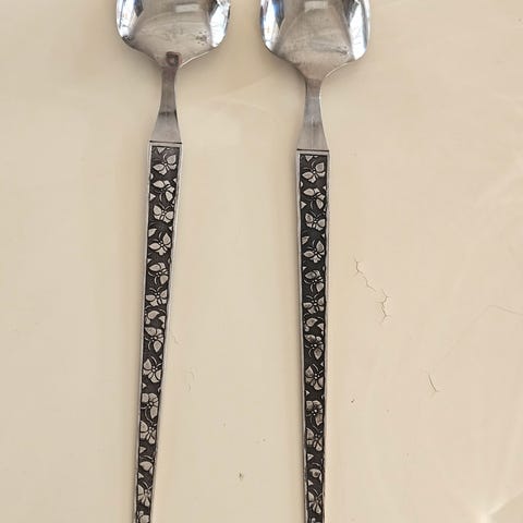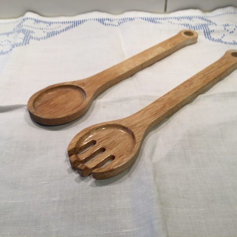 Norsk salatbestikk i stål med furuskaft