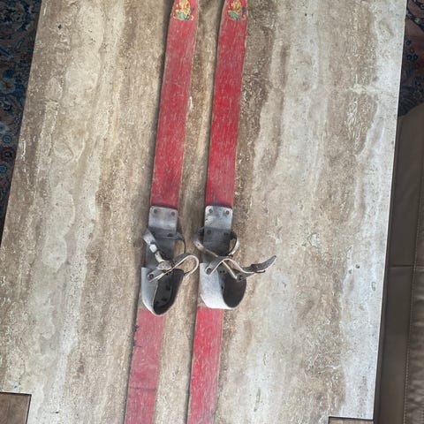 Vintage langrennski for barn laga av tre, som min far brukte da han var liten. Emblem i framtupp og barnefigur på ski litt lengre ned. Lærsåle med hælfeste slik at ein kan spenne fast vanlege støvlar. Bruksslitasje.