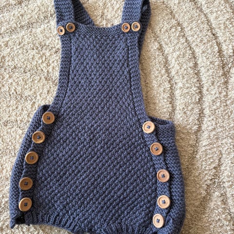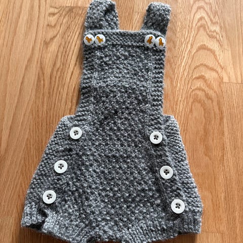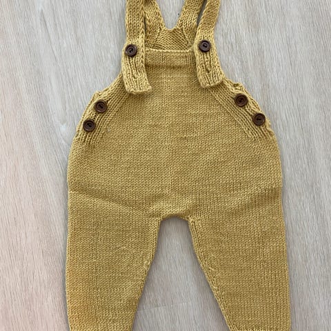 Supersøt kjappstrikka drakt i str nyfødt (ca 0-3 mnd vil jeg tro). Okergul farge. Pent brukt. Selges for 70 kr.