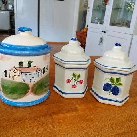 2 stk nostalgiske krukker. Den ene har et bittelite skår innenfor lokket, se siste bilde.