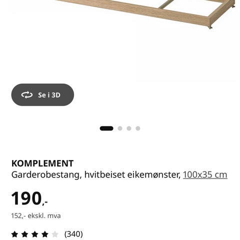 1 stk IKEA Komplement Garderobestang, hvit, 75 cm,