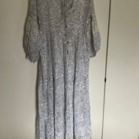 Brukt en dag, nyvasket, nederste delen flekkene ble ikke borte kan evtl klippes bort, modellen er 167 cm høy pga den var for lang så man har noe å gå på. Kan passe til 42/44,