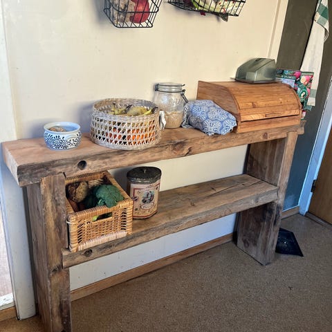 Håndlaget hylleskap med utskjært dekor, selges billig