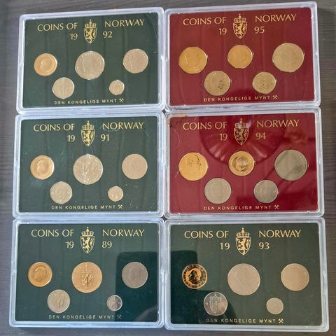 Proofsett fra perioden 1992 til 2002 selges. Alle settene er kjøpt direkte fra Den Kongelige Mynt på Kongsberg. Settene er veldig pene og fremstår som nye. Send gjerne melding om det er enkelte sett dere ønsker flere bilder av.