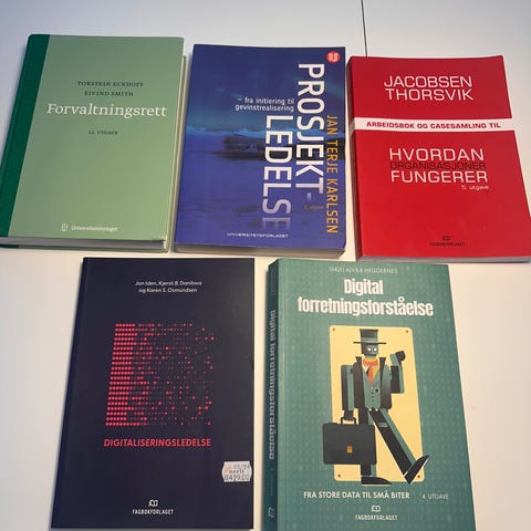 Alle bøkene er pensum for første og andre semester på bachelor; ledelse og administrasjon i offentlig virksomhet.