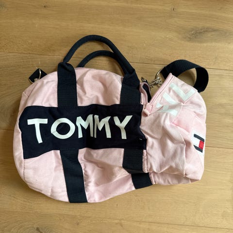 Lite brukt blåog grå Tommy Hilfiger veske/bag i stoff med skinnremmer og detaljer.