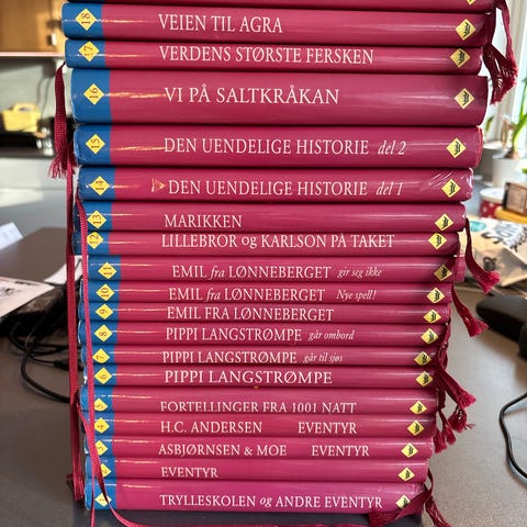 13 meget flotte bøker i serien DAMMS BESTE BARNEBOK KLASSIKERE. De er NYE! Flott innbundet i mørk rød og med omslag, og alle er 2 opplag 2000. Høyde 25 cm, bredde 17,5 cm. Disse 10 bøkene er: - bok NR. 1 - MICHAEL ENDE «TRYLLERSKOLEN OG ANDRE EVENTYR»har 249 sider. NR. 2- ASTRID LINDGREN «EVENTYR, har 188 sider, veier 545 gram. NR. 3- «ASBJØRNSEN OG MOE - EVENTYR», boken har 154 sider, veier 485 gram. NR. 4- «H. C. ANDERSEN EVENTYR». Boken har 149 sider, veier 470 gram. NR. 9- ASTRID LINDGREN «EMIL FRA LØNNEBERGET» har 91 sider, veier 355 gram.. NR. 10- ASTRID LINDGREN «EMIL FRA LØNNEBERGET NYE SPRELL» har 123 sider, veier 420 gram. NR. 11 -ASTRID LINDGREN «EMIL FRA LØNNEBERGET GIR SEG IKKE» har 156 sider, veier 490 gram. Nr. 12- ASTRID LINDGREN «LILLEBROR OG KARLSON PÅ TAKET» har 116 sider, veier 410 gram. NR. 13.-ASTRID LINDGREN «MARIKKEN» har 485 gram, veier 485 gram. NR. 17- ROALD DAHL «VERDENS STØRSTE FERSKEN», har 114 sider, veier 415 gram. NR. 18 - AIMÉE ENDE «VEIEN TIL AGRA», har 148 sider, veier 465 gram. NR. 19 - FINN HAVREVOLD «MARENS LILLE UGLE» har 143 sider, veier 450 gram. Nr. 20- BABBIS FRIIS-BAASTAD «KJERSTI». Boken har 237 sider, veier 445 gram. «Se bilder av alle bøkene. De 3 EMIL bøkene har skrevet et lite fornavn øverst på omslaget og inni boken, øverst til høyre permen. De selges billigere, kr. 40,- pr. stk. (ellers er de like fine som de andre). Bøkene selges kr. 50,- pr. stk. Bøkene kan sendes, eller hentes her i Sandefjord, eller avtale henting i Tønsberg på Tolvsrød. Kan også sende via Finn.no «helthjem», koster kr. 82,- inntil 5 kg! Forsikret og med sporing.