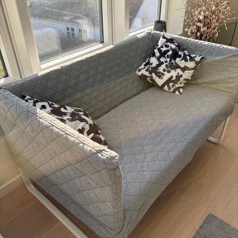IKEA sofa i lys farge. To seter med puter.