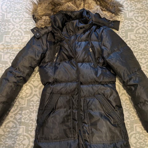 Med to lommer og hette, og fuskepels på hetten. Fuskepelsen kan taes av.