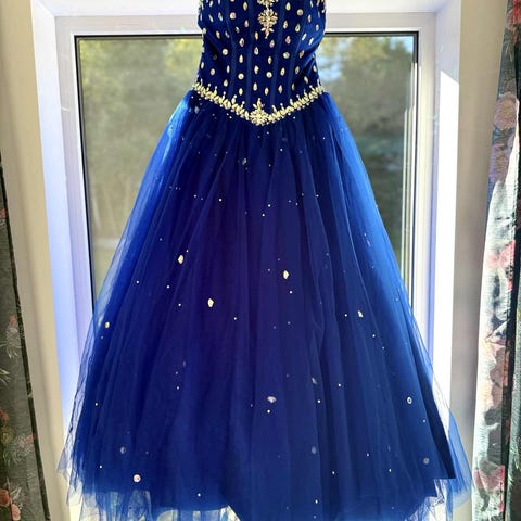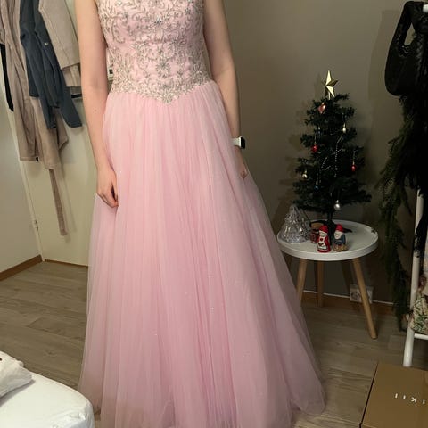 Nydelig ferskenrosa ballkjole søker nye festligheter. Den er nyrenset og klar for ball , passer perfekt om du er ca 155-165 høy, og str S /liten M. Selges for 1200,-