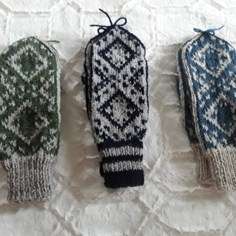 Hjemmestrikket votter selges. De er strikket i 100% ull, superwash.