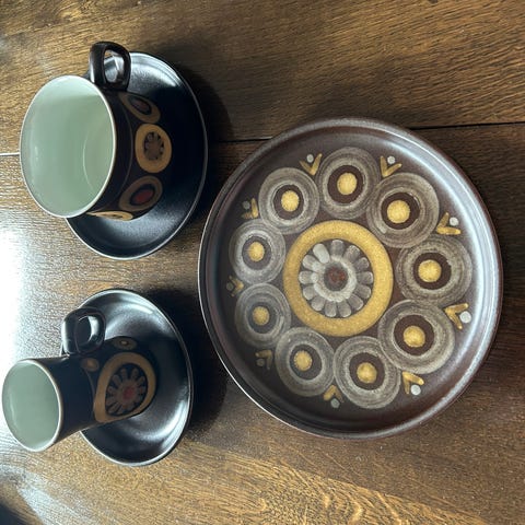 Denby arabesque suppeterrin. Høyde 15 cm. Diameter 18 cm. Lite skår i lokket. Se bilde.