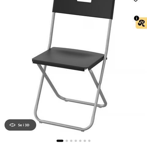 Leier ut våre klappstoler. Har fire hvite og fire svarte. Leies ut for 25 kr per stykk.