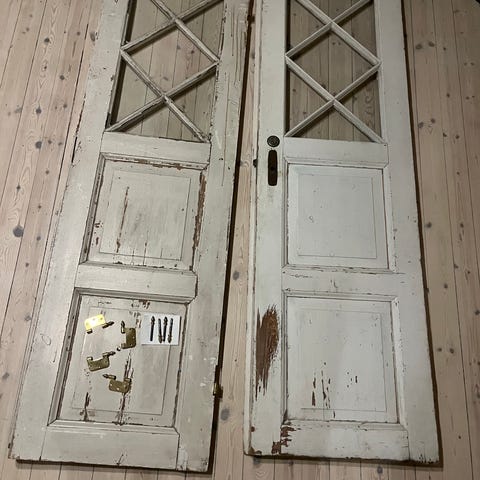 Gammel ytterdør, antar fra ca 50-60-tallet. Mål: 250 cm • 148 cm yttermål karm. Materiale teak heltre. Overmalt på utsiden, lakkert på innside. Det ene glassfeltet i døren ser ut til å være skiftet ut etter montering og har ulikt glass fra de tre andre feltene + overlys. Treverk ser ut til å være i god stand bak maling, ingen råte. Brevluke innfelt i dør. Døren er demontert og klart til henting. Lås/låskasse mangler.