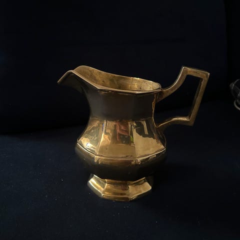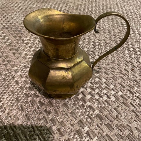 Nydelig og klassisk kanne i messing til salgs. Mest sannsynlig håndlaget og veldig gammel. Også mest sannsynlig en antikvitet, skjønt jeg vet ikke nok om dette til å kunne si noe mer om opphavet. Kannen er veldig tung og har tykke vegger. Trolig støpt. Kan brukes både til servering (saus, fløte, sirup etc), pynt, dekorasjon eller blomster. Høyden er ca 11cm og diameter ca 10cm.