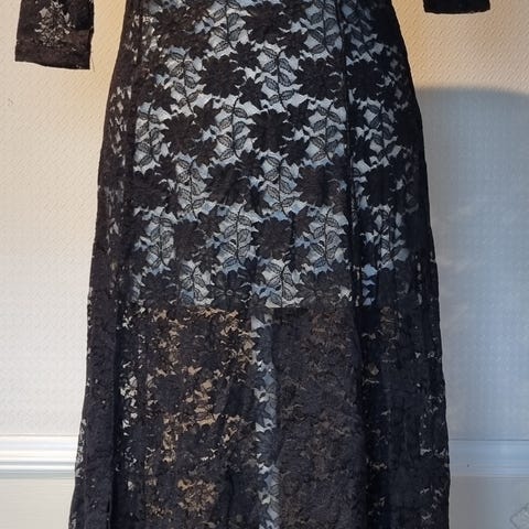 Elegant og iøynefallende kjole i svart, detaljert blonde med rød underkjole.